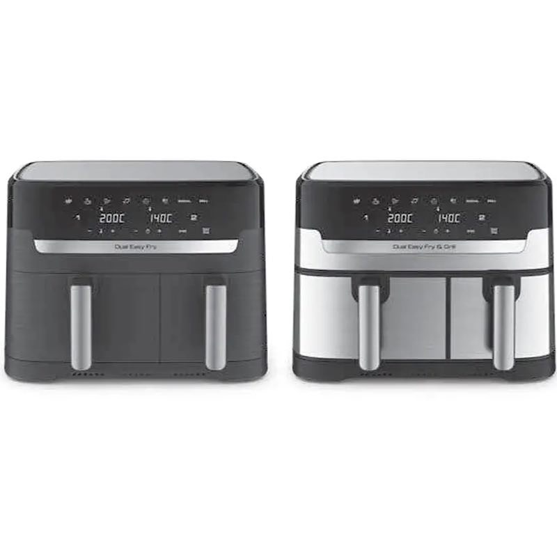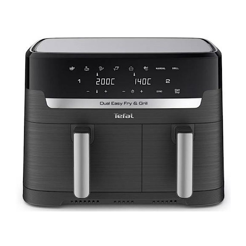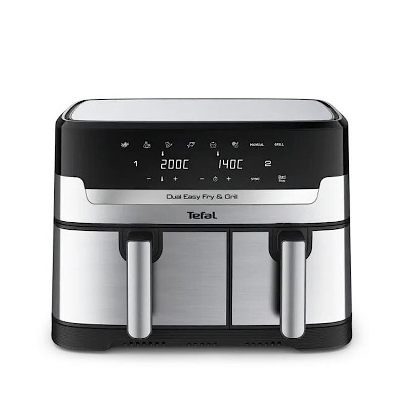 سرخکن تفال EY905 D با وزن تقریبی ۷.۸ کیلوگرم، یک دستگاه دوکاره (ایرفرایر + گریل) با دو محفظهی مستقل—یکی بزرگ XXL و دیگری کوچک—است. این طراحی به شما امکان میدهد همزمان دو نوع غذا را پخت کنید و با قابلیت همگامسازی (SYNC)، همه با هم آماده شوند. فناوری Extra Crisp و سینی گریل آلومینیوم ریختهگری برای پخت ترد و بدون روغن در نظر گرفته شده است. همچنین ۸ برنامه خودکار با امکان پخت گریل، برشته، پخت، یخزدایی و حالت دستی دارد، و قطعات قابل شستوشوی ماشینظرفشویی، تمیزکاری را آسان کردهاند. این دستگاه تا ۷۰٪ مصرف انرژی کمتر و ۴۰٪ سریعتر پخت نسبت به فرهای معمولی دارد.