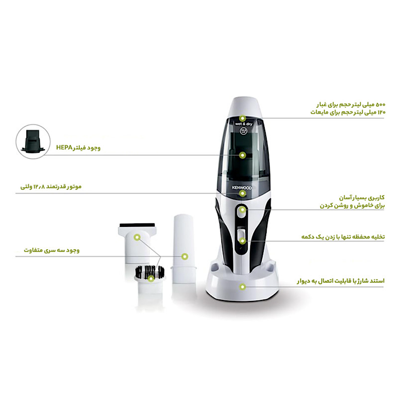 جارو شارژی کنوود مدل HVP19 یک دستگاه دستی با قابلیت مکش خشک و مرطوب است که با باتری لیتیوم یونی ۱۴.۸ ولتی عرضه میشود. این دستگاه با طراحی ارگونومیک و وزن سبک، برای تمیزکاری سریع و آسان در منزل، خودرو یا محل کار مناسب است. مخزن گرد و غبار با ظرفیت ۵۰۰ میلیلیتر و مخزن مایعات با ظرفیت ۱۲۰ میلیلیتر، امکان جمعآوری انواع آلودگیها را فراهم میکند. فیلتر قابل شستشو، برس مخصوص مبلمان، نازل شکاف و پایه شارژ از دیگر ویژگیهای این جارو شارژی هستند.